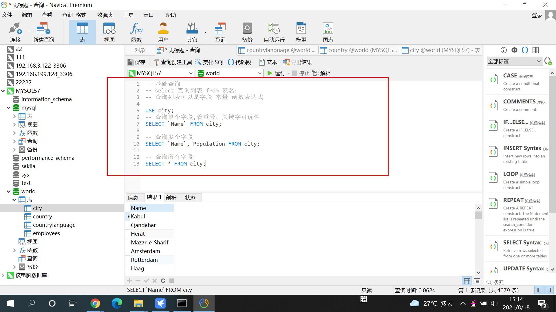 4. 注释 单行# 或者--空格 多行/* 注释文字*/