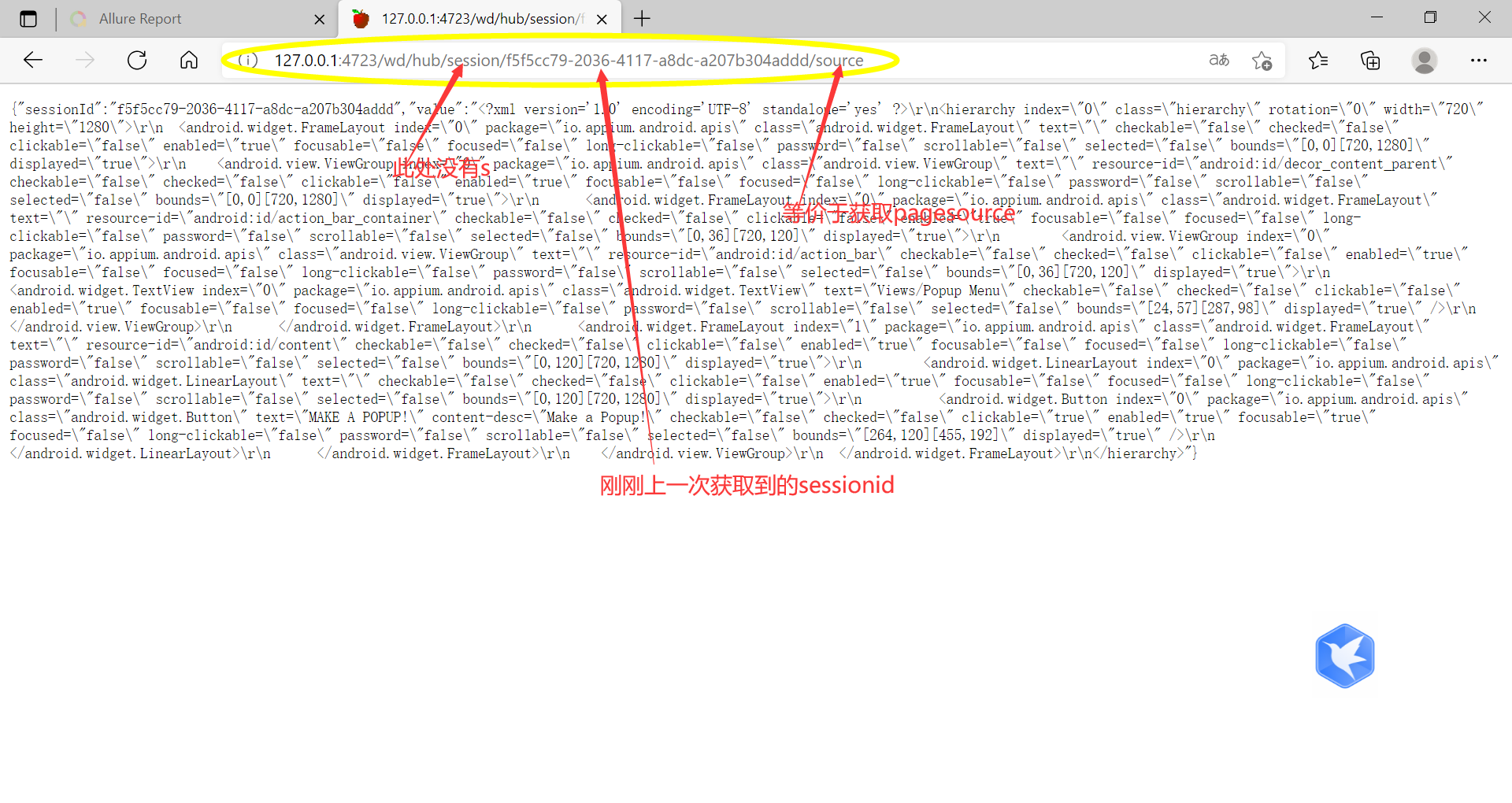 再通过http://127.0.0.1:4723/wd/hub/session/sessionid/source 获取到pagesource内容