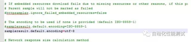 2、打开jmeter.properties配置文件,找到“sampleresult.default.encoding”这个配置项,将原来的默认值“ISO-8859-1”修改为“utf-8”即可,修改后的配置如下所示: