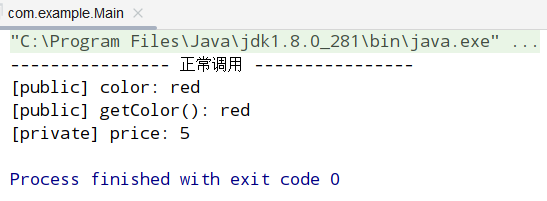 Apple apple = new Apple(); apple.setColor("red"); apple.setPrice(5); System.out.println("---------------- 正常调用 ----------------"); System.out.println("[public] color: " + apple.color); System.out.println("[public] getColor(): " + apple.getColor()); System.out.println("[private] price: "+apple.getPrice());