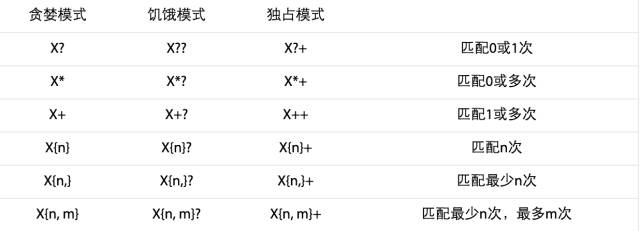 量词匹配分为 饥饿模式,贪婪模式,独占模式。饥饿模式 匹配尽可能少的文本。贪婪模式匹配尽可能多的文本。独占模式匹配尽可能多的文本,甚至导致剩余表达式匹配失败。