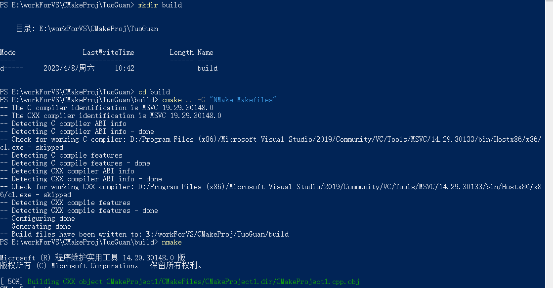 6) 进入到CMakeTest/Src目录,执行以下代码mkdir build & cdbuild