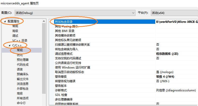 【项目】--> 【属性】-- “属性页” --> 【配置属性】--> 【C/C++】--> 【常规】-->【附件包含目录】