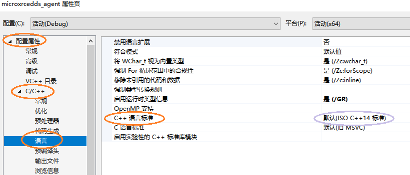 【项目】--> 【属性】-- 属性页 --> 【配置属性】--> 【C/C++】--> 【语言】-->【C++语言标准】
