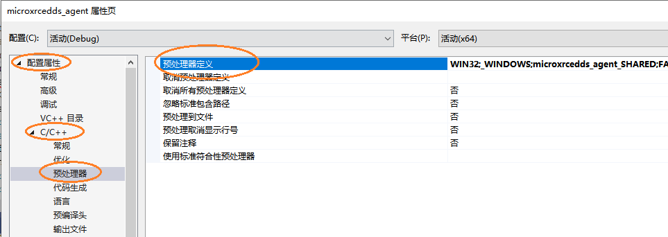 【项目】--> 【属性】-- 属性页 --> 【配置属性】--> 【C/C++】--> 【预处理器】-->【预处理器定义】
