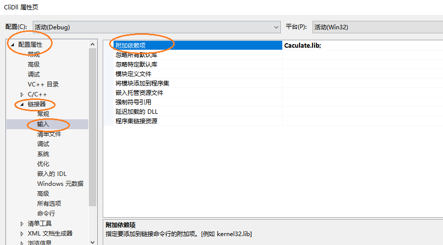 【项目】--> 【属性】-- 属性页 --> 【配置属性】--> 【链接器】--> 【输入】-->【附加依赖项】
