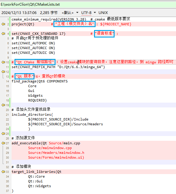 上图Clion的 配置,与下图生成的 CMakeList.txt 文件中的 变量 关系。注意,QT6必须C++17以上的标准。
