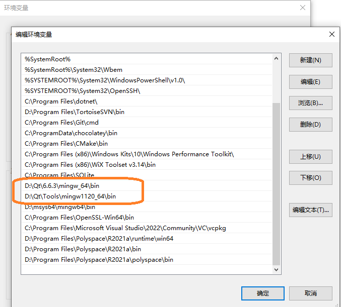 Qt 库路径 和 编译工具链路径,添加到系统变量 path 中, 只需添加红色方框内的即可