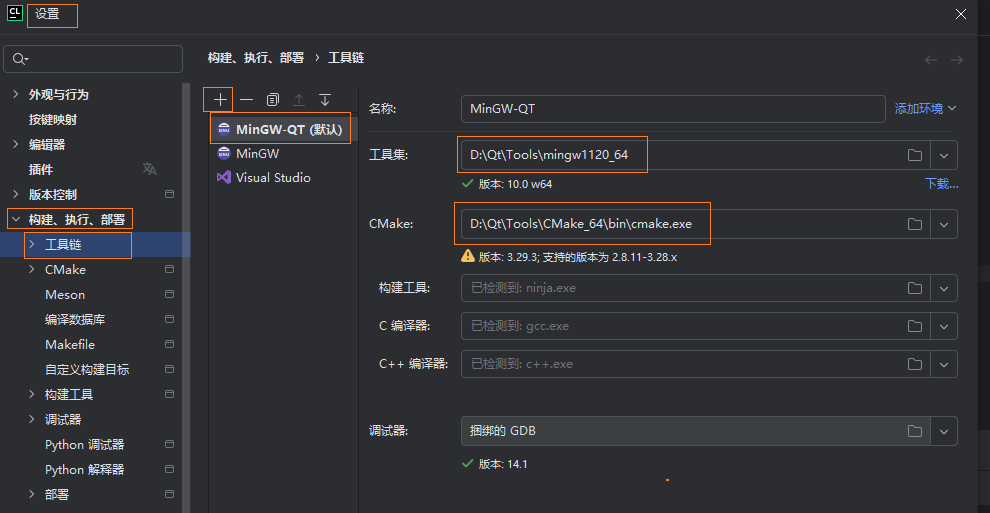 在设置 -> 构建、执行、部署 -> 工具链,选项中创建 "MinGW-QT" 工具链。配置 “工具集” 和 "CMake"