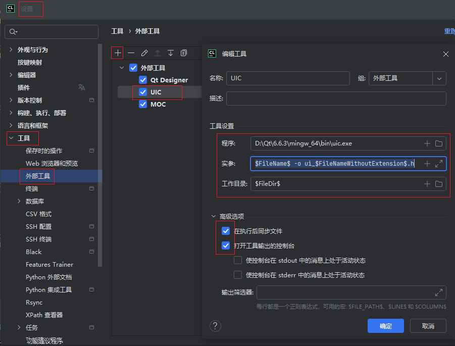 程序: D:\Qt\6.6.3\mingw_64\bin\uic.exe 实参: $FileName$ -o ui_$FileNameWithoutExtension$.h 工作目录:$FileDir$