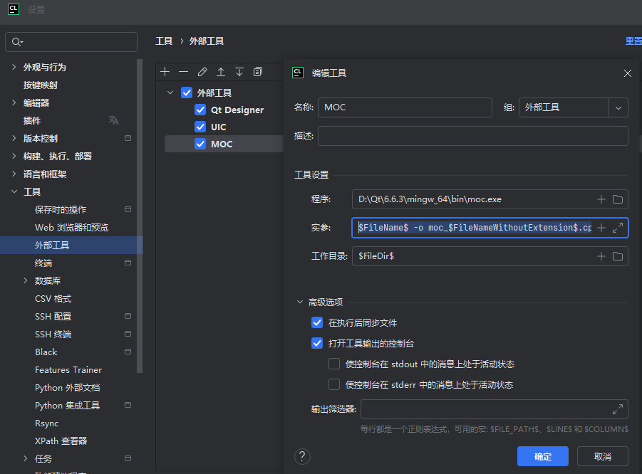 程序: D:\Qt\6.6.3\mingw_64\bin\moc.exe 实参: $FileName$ -o moc_$FileNameWithoutExtension$.cpp 工作目录:$FileDir$