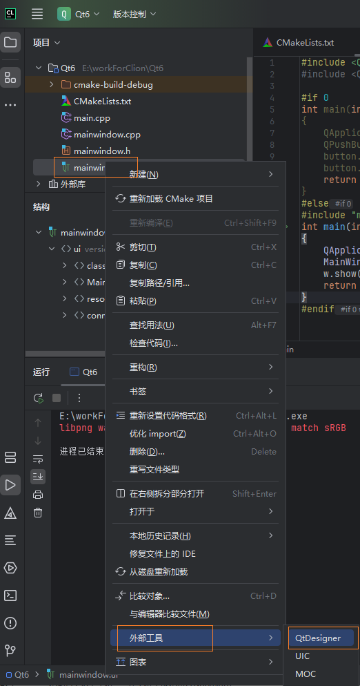 右键菜单 mainwindow.ui 文件,选择:外部工具 -> QtDesigner, 打开 “Qt 设计师” 软件
