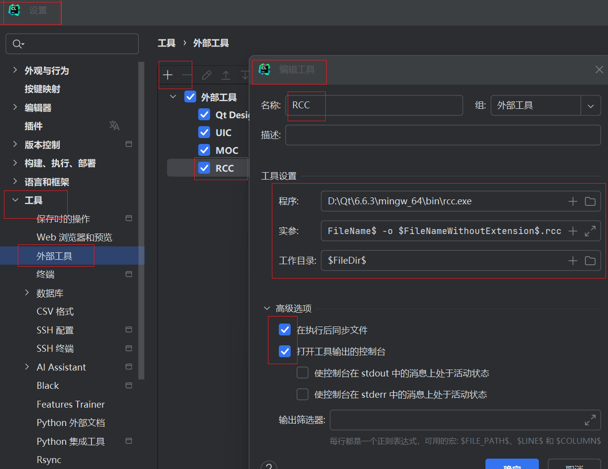 程序:D:\Qt\6.6.3\mingw_64\bin\rcc.exe 实参: --binary $FileName$ -o $FileNameWithoutExtension$.rcc 工作目录: $FileDir$