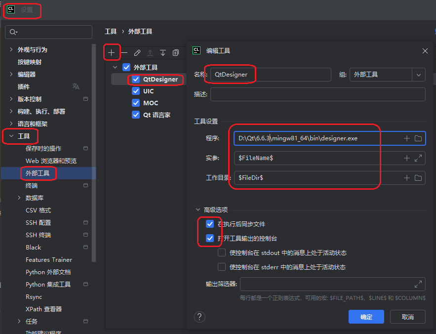 程序: D:\Qt\6.6.3\mingw_64\bin\designer.exe 实参: $FileName$ 工作目录: $FileDir$