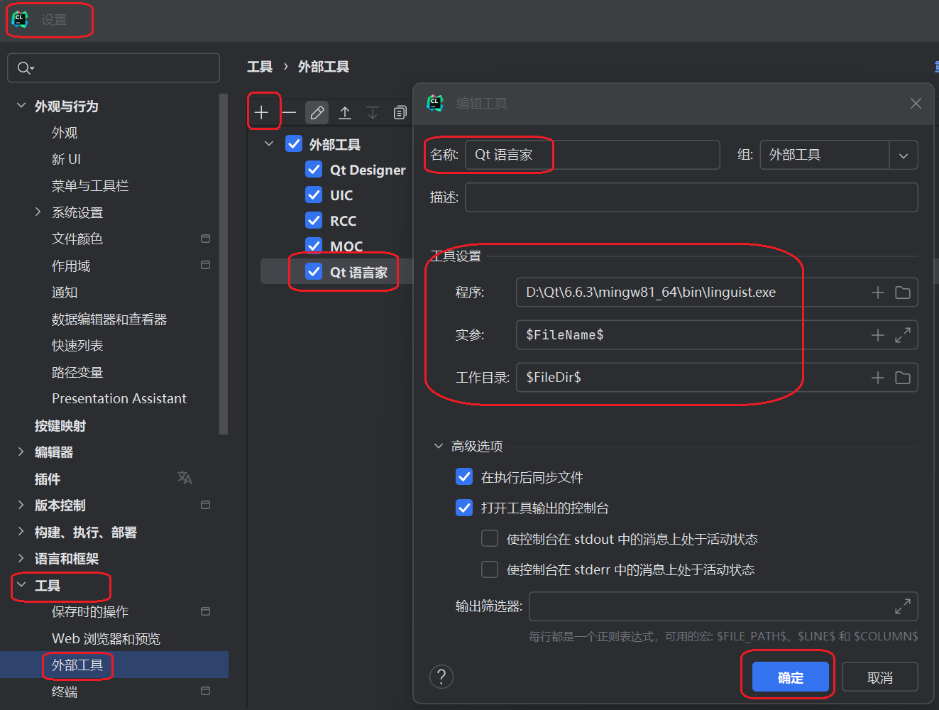 程序: D:\Qt\6.6.3\mingw81_64\bin\linguist.exe 实参: $FileName$ 工作目录: $FileDir$
