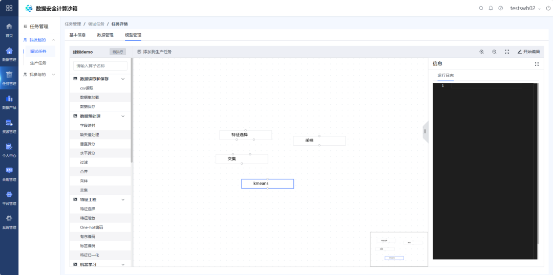 四、数据沙箱计算。将数据加工过程拆分为调试环境和生产环境。其中,调试环境使用用户发布的脱敏后的样本数据,进行在线编码和调试;进入生产环境需要数据持有方对数据进行审批,数据需求方可设置是否开启模型审查,采用一场景一审批的方式,当数据审批完成后才可执行全量的生产任务。