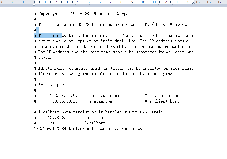 1 [root@localhost ~]# ip addr add 192.168.149.84/24 dev ens33 2 [root@localhost ~]# ip a s ens33 3 2: ens33: <BROADCAST,MULTICAST,UP,LOWER_UP> mtu 1500 qdisc fq_codel state UP group default qlen 1000 4 link/ether 00:0c:29:bc:11:bf brd ff:ff:ff:ff:ff:ff 5 inet 192.168.149.85/24 brd 192.168.149.255 scope global noprefixroute ens33 6 valid_lft forever preferred_lft forever 7 inet 192.168.149.84/24 scope global secondary ens33 8 valid_lft forever preferred_lft forever 9 inet6 fe80::20c:29ff:febc:11bf/64 scope link 10 valid_lft forever preferred_lft forever 添加一个84的新ip 11 12 [root@localhost ~]# vim /usr/local/apache/conf/extra/httpd-vhosts.conf 13 <VirtualHost 192.168.149.85:80> 14 DocumentRoot "/usr/local/apache/htdocs/test.example.com" 15 ServerName test.example.com 16 ErrorLog "logs/test.example.com-error_log" 17 CustomLog "logs/test.example.com-access_log" common 18 </VirtualHost> 19 <VirtualHost 192.168.149.84:80> 20 DocumentRoot "/usr/local/apache/htdocs/blog.example.com" 21 ServerName blog.example.com 22 ErrorLog "logs/blog.example.com-error_log" 23 CustomLog "logs/blog.example.com-access_log" common 24 </VirtualHost> 把*号去掉输入要访问的ip 25 [root@localhost ~]# systemctl stop httpd 先停掉 26 [root@localhost ~]# ss -antl 27 State Recv-Q Send-Q Local Address:Port Peer Address:Port Process 28 LISTEN 0 128 0.0.0.0:22 0.0.0.0:* 29 LISTEN 0 128 [::]:22 [::]:* 30 [root@localhost ~]# systemctl start httpd在启动 31 [root@localhost ~]# ss -antl 32 State Recv-Q Send-Q Local Address:Port Peer Address:Port Process 33 LISTEN 0 128 0.0.0.0:22 0.0.0.0:* 34 LISTEN 0 128 *:80 *:* 35 LISTEN 0 128 [::]:22 [::]:* 36
