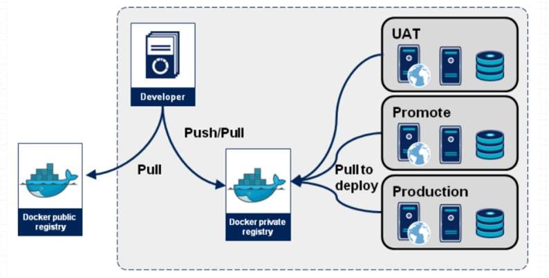 Docker Registry中的镜像通常由开发人员制作,而后推送至“公共”或“私有”Registry上保存,供其他人员使用,例如“部署”到生产环境。