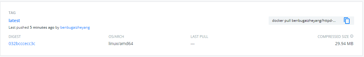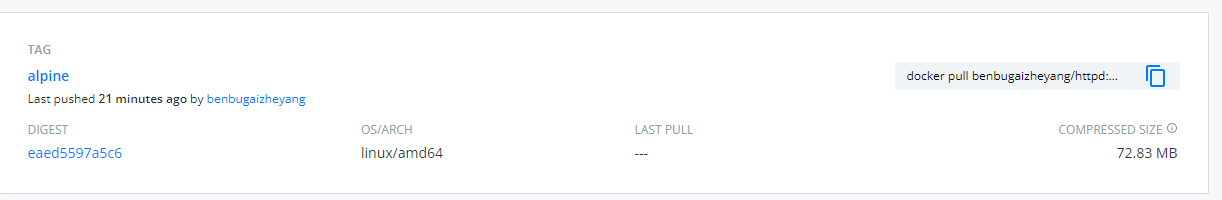 [root@localhost apache]# vim Dockerfile FROM alpine LABEL MANTAINER "benbugaizheyang 122271071@qq.com" ENV VERSION 2.4.53 ENV PATH /usr/local/apache/bin:$PATH EXPOSE 80 443 ADD files/apr-1.7.0.tar.gz /tmp/ ADD files/apr-util-1.6.1.tar.gz /tmp/ ADD files/httpd-${VERSION}.tar.gz /tmp/ RUN adduser -SHs /sbin/nologin apache && \ sed -i 's/dl-cdn.alpinelinux.org/mirrors.aliyun.com/' /etc/apk/repositories && \ apk add --no-cache -U openssl-dev pcre-dev expat-dev libtool gcc libc-dev make && \ cd /tmp/apr-1.7.0 && \ sed -i '/$RM "$cfgfile"/d' configure && \ ./configure --prefix=/usr/local/apr && \ make && make install && \ cd ../apr-util-1.6.1 && \ ./configure --prefix=/usr/local/apr-util --with-apr=/usr/local/apr && \ make && make install && \ cd ../httpd-${VERSION} && \ ./configure --prefix=/usr/local/apache \ --enable-so \ --enable-ssl \ --enable-cgi \ --enable-rewrite \ --with-zlib \ --with-pcre \ --with-apr=/usr/local/apr \ --with-apr-util=/usr/local/apr-util/ \ --enable-modules=most \ --enable-mpms-shared=all \ --with-mpm=prefork && \ make && make install && \ apk del --no-cache -U gcc libc-dev make && \ # 删除工具包 rm -rf /tmp/* WORKDIR /usr/local/apache CMD ["-D","FOREGOUND"] ENTRYPOINT ["/usr/local/apache/bin/httpd"] WORKDIR /usr/local/apache [root@localhost apache]# \cp Dockerfile files/install.sh # 复制D 到f/i里去,\覆盖一下 [root@localhost apache]# vim files/install.sh # 写脚本 #!/bin/sh adduser -SHs /sbin/nologin apache && \ sed -i 's/dl-cdn.alpinelinux.org/mirrors.aliyun.com/' /etc/apk/repositories && \ apk add --no-cache -U openssl-dev pcre-dev expat-dev libtool gcc libc-dev make && \ cd /tmp/apr-1.7.0 && \ sed -i '/$RM "$cfgfile"/d' configure && \ ./configure --prefix=/usr/local/apr && \ make && make install && \ cd ../apr-util-1.6.1 && \ ./configure --prefix=/usr/local/apr-util --with-apr=/usr/local/apr && \ make && make install && \ cd ../httpd-${VERSION} && \ ./configure --prefix=/usr/local/apache \ --enable-so \ --enable-ssl \ --enable-cgi \ --enable-rewrite \ --with-zlib \ --with-pcre \ --with-apr=/usr/local/apr \ --with-apr-util=/usr/local/apr-util/ \ --enable-modules=most \ --enable-mpms-shared=all \ --with-mpm=prefork && \ make && make install && \ apk del --no-cache -U gcc libc-dev make && \ rm -rf /tmp/* # 修改如上 [root@localhost apache]# vim Dockerfile # 修改如下 FROM alpine LABEL MANTAINER "benbugaizheyang 122271071@qq.com" ENV VERSION 2.4.53 ENV PATH /usr/local/apache/bin:$PATH EXPOSE 80 443 ADD files/apr-1.7.0.tar.gz /tmp/ ADD files/apr-util-1.6.1.tar.gz /tmp/ ADD files/httpd-${VERSION}.tar.gz /tmp/ ADD files/install.sh /tmp/ RUN /bin/sh /tmp/install.sh WORKDIR /usr/local/apache CMD ["-D","FOREGOUND"] ENTRYPOINT ["/usr/local/apache/bin/httpd"] [root@localhost apache]# docker build -t benbugaizheyang/httpd-alpine:latest . # 脚本制作镜像 [root@localhost apache]# docker images REPOSITORY TAG IMAGE ID CREATED SIZE benbugaizheyang/httpd-alpine latest cb5cd0cea5bb 9 minutes ago 112MB # 112mb benbugaizheyang/httpd alpine 0831aabfaf27 About an hour ago 234MB [root@localhost apache]# docker push benbugaizheyang/httpd-alpine # 上传镜像