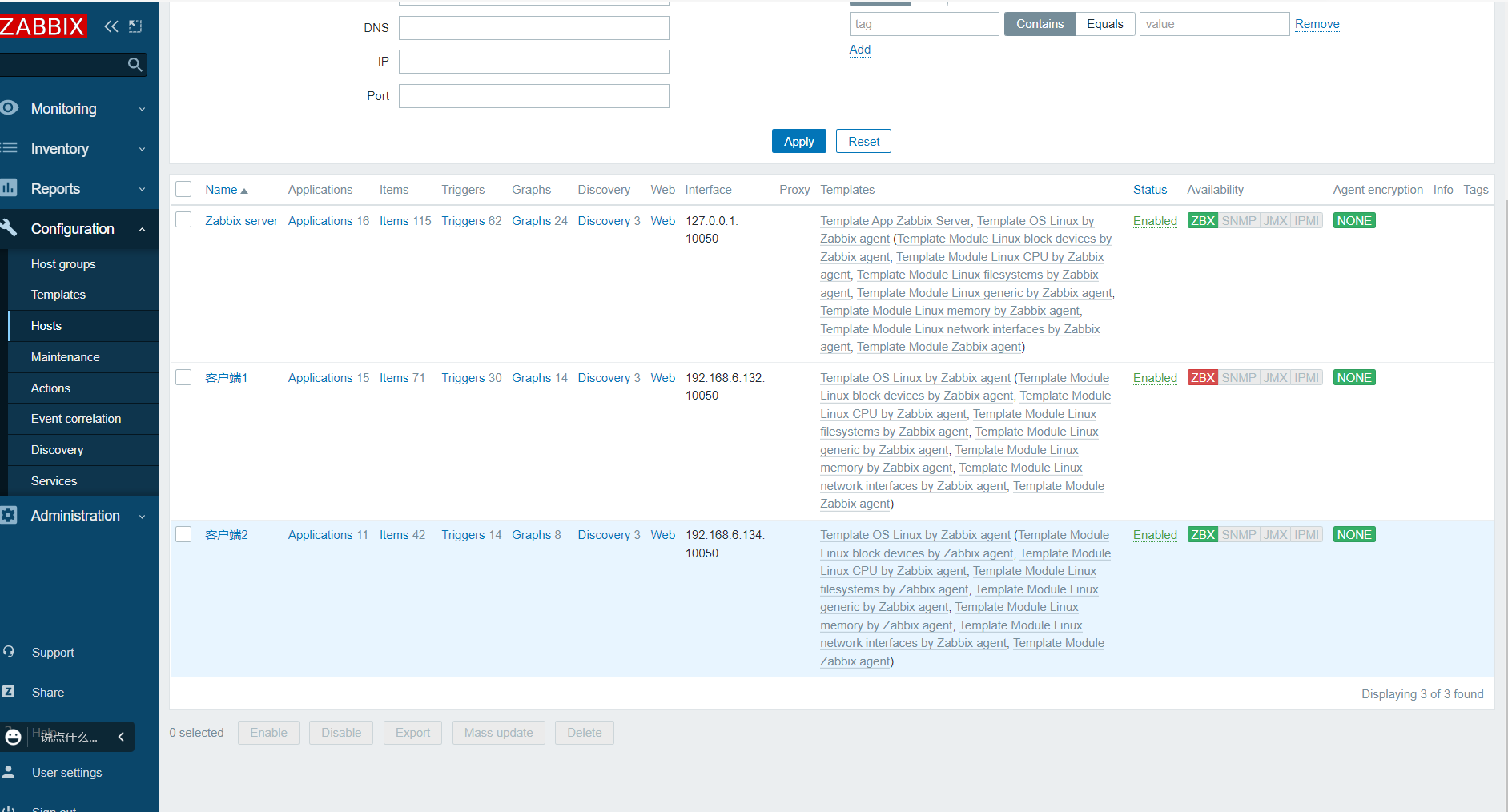 [root@localhost scripts]# pkill zabbix_agentd [root@localhost scripts]# zabbix_agentd [root@localhost scripts]# ss -antl State Recv-Q Send-Q Local Address:Port Peer Address:PortProcess LISTEN 0 128 0.0.0.0:22 0.0.0.0:* LISTEN 0 128 0.0.0.0:10050 0.0.0.0:* LISTEN 0 128 [::]:22 [::]:* LISTEN 0 80 *:3306 *:*