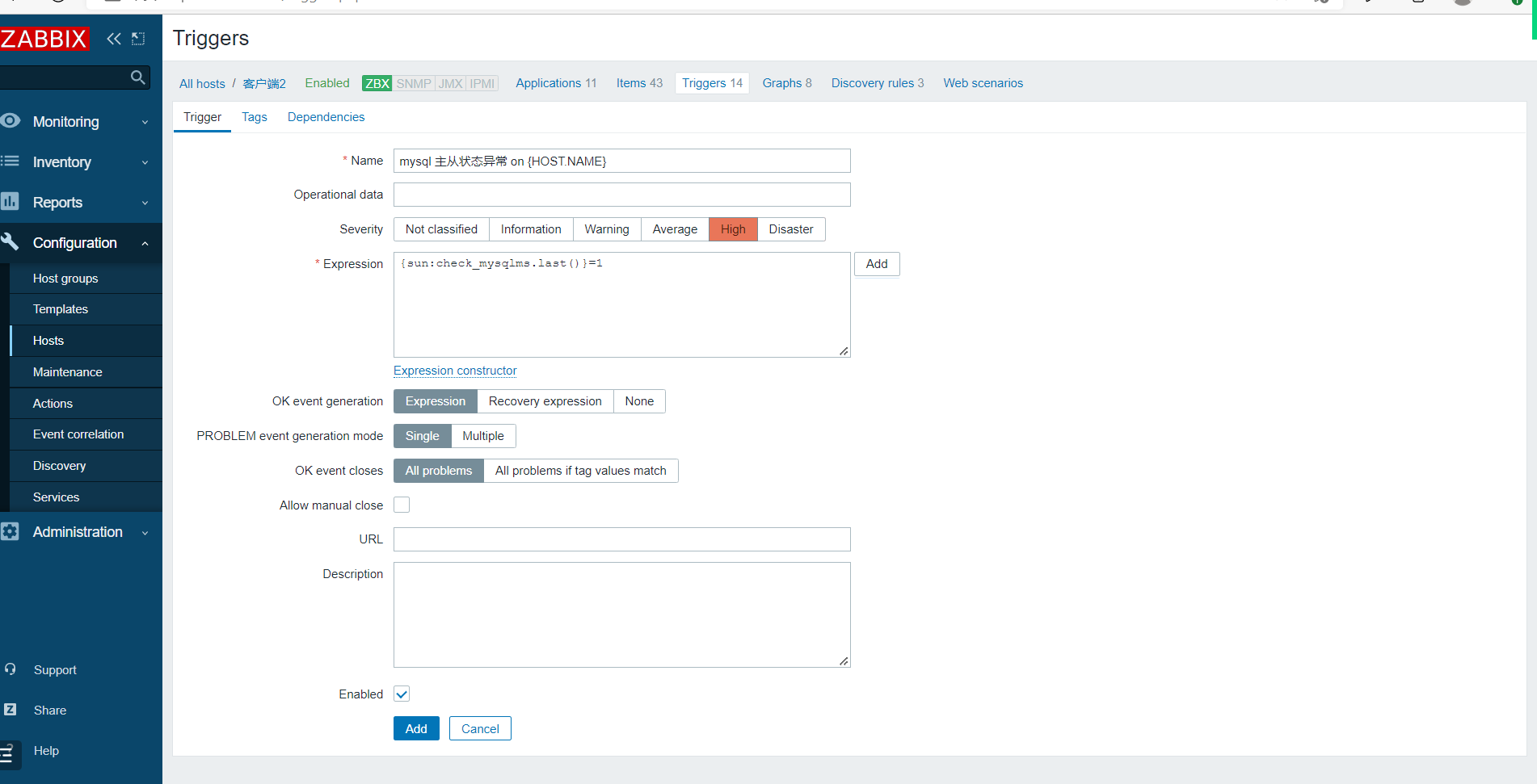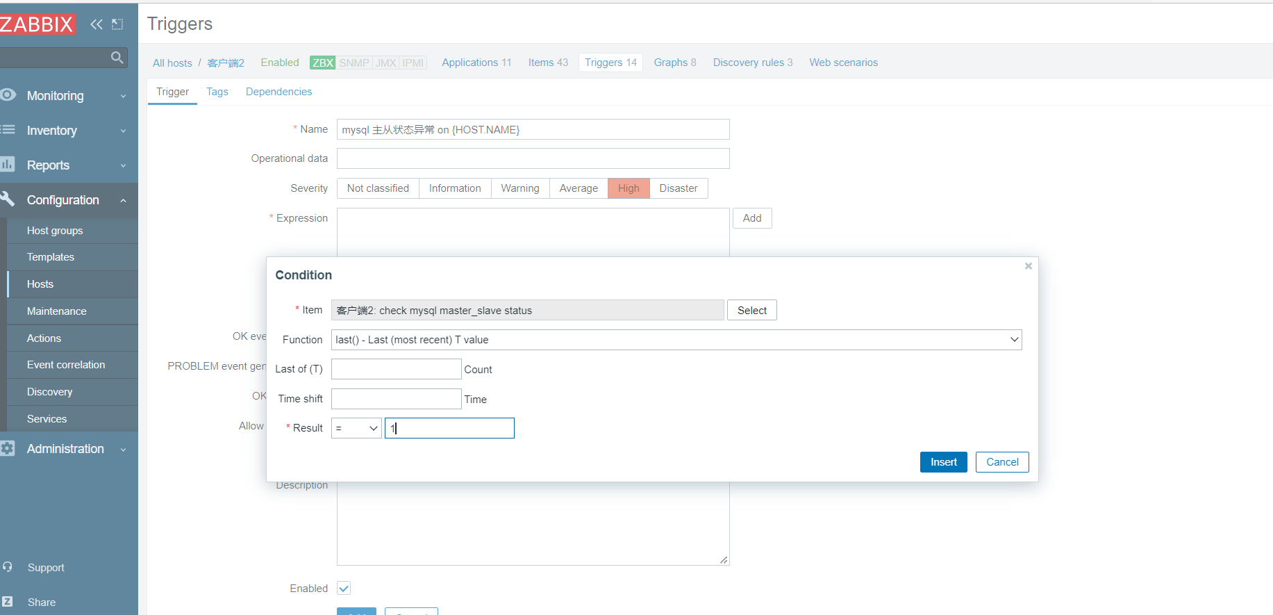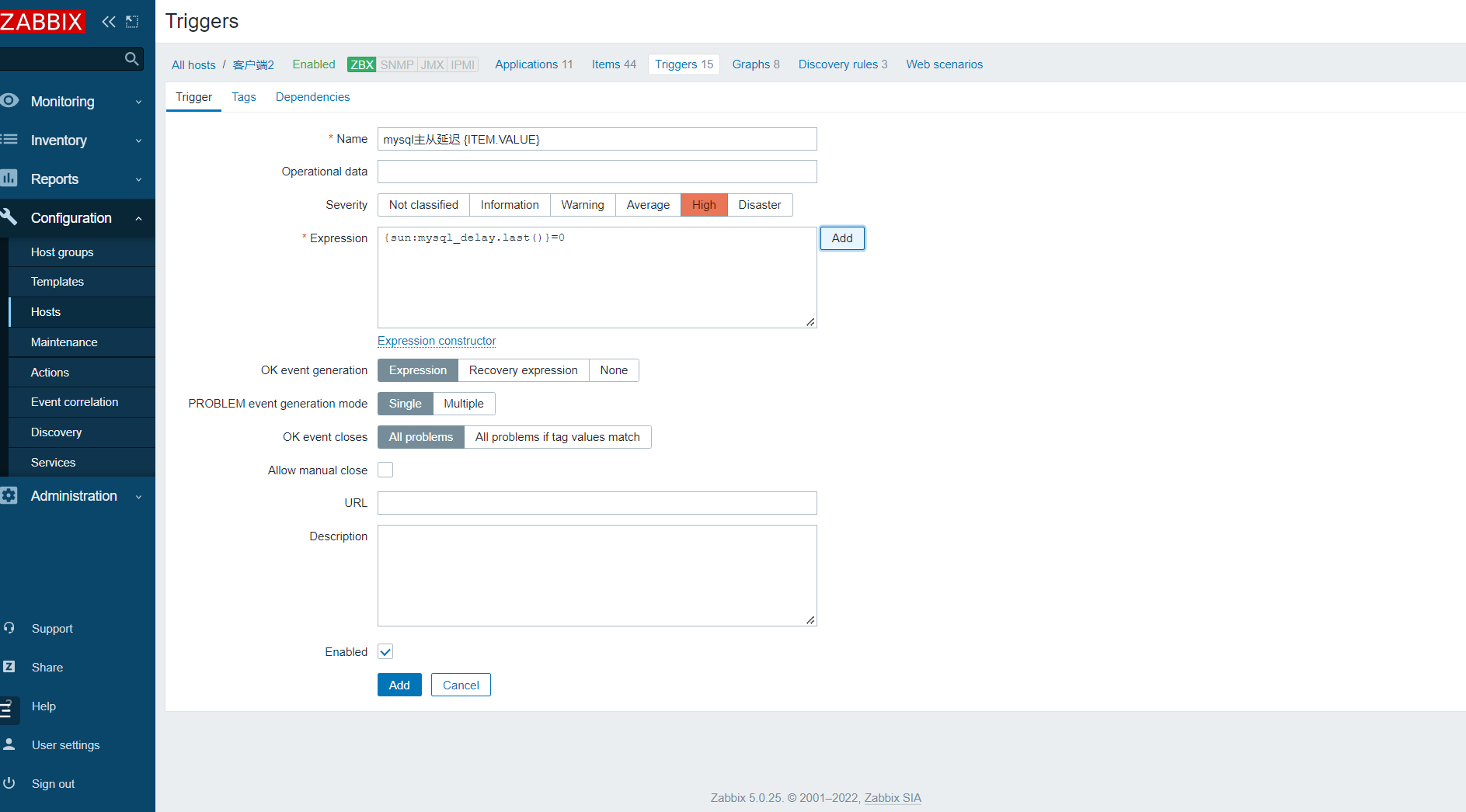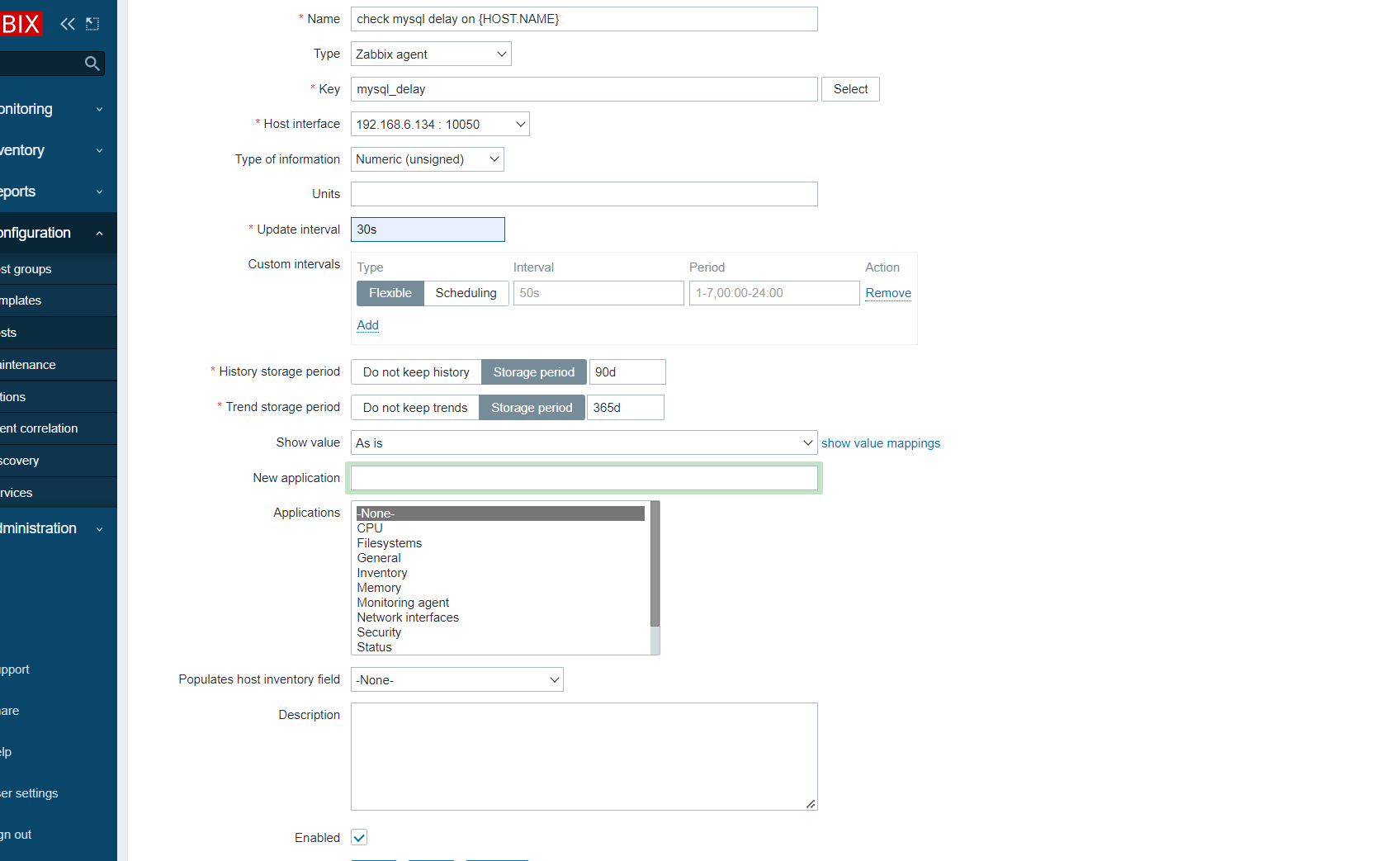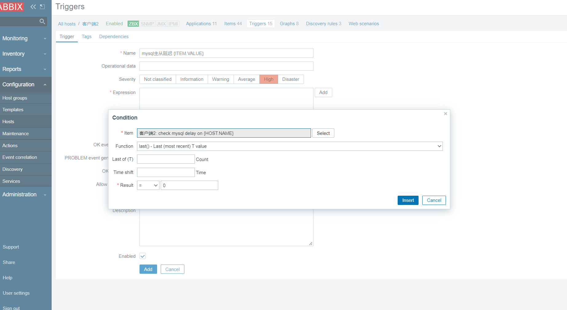 [root@localhost ~]# cd /scripts/ [root@localhost scripts]# vi mysql_delay.sh #!/bin/bash delay=$( mysql -uroot -p123456 -e "show slave status\G" 2>/dev/null | grep 'Seconds_Behind_Master'| awk '{print $2}') echo $delay ~ [root@localhost scripts]# chmod +x mysql_delay.sh #添加执行权限 [root@localhost scripts]# ll 总用量 8 -rwxr-xr-x 1 root root 145 7月 12 00:58 mysql_delay.sh -rwxr-xr-x 1 root root 173 7月 12 00:29 mysqlms.sh [root@localhost scripts]# ./mysql_delay.sh 0 [root@localhost scripts]# vi /usr/local/etc/zabbix_agentd.conf UserParameter=mysql_delay,/bin/bash /scripts/mysql_delay.sh #添加到最后一行 [root@localhost scripts]# pkill zabbix #停启服务 [root@localhost scripts]# zabbix_agentd [root@zabbix-server etc]# zabbix_get -s 192.168.6.134 -k mysql_delay # 服务端测试 0