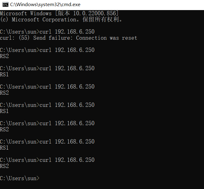 # 在Rs1,Rs2下载nginx写一个网页文件 [root@rs1 ~]# dnf -y install nginx [root@rs1 ~]# echo 'rs1' > /usr/share/nginx/html/index.html [root@rs1 ~]# systemctl enable --now nginx Created symlink /etc/systemd/system/multi-user.target.wants/nginx.service → /usr/lib/systemd/system/nginx.service. [root@rs2 ~]# dnf -y install nginx [root@rs2 ~]# echo 'rs2' > /usr/share/nginx/html/index.html [root@rs2 ~]# systemctl enable --now nginx Created symlink /etc/systemd/system/multi-user.target.wants/nginx.service → /usr/lib/systemd/system/nginx.service.