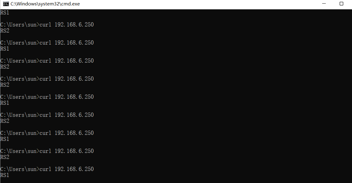 #在RS1和RS2上配置VIP [root@rs1 ~]# yum -y install net-tools [root@rs1 ~]# ifconfig lo:0 192.168.6.250/32 broadcast 192.168.6.250 up [root@rs1 ~]# ifconfig lo:0 192.168.6.250/32 broadcast 192.168.6.250 up [root@rs1 ~]# ip a 1: lo: <LOOPBACK,UP,LOWER_UP> mtu 65536 qdisc noqueue state UNKNOWN group default qlen 1000 link/loopback 00:00:00:00:00:00 brd 00:00:00:00:00:00 inet 127.0.0.1/8 scope host lo valid_lft forever preferred_lft forever inet 192.168.6.250/0 brd 192.168.6.250 scope global lo:0 valid_lft forever preferred_lft forever inet6 ::1/128 scope host valid_lft forever preferred_lft forever 2: ens160: <BROADCAST,MULTICAST,UP,LOWER_UP> mtu 1500 qdisc mq state UP group default qlen 1000 link/ether 00:0c:29:e2:21:19 brd ff:ff:ff:ff:ff:ff inet 192.168.6.135/24 brd 192.168.6.255 scope global noprefixroute ens160 valid_lft forever preferred_lft forever [root@rs1 ~]# route add -host 192.168.6.180 dev lo [root@rs1 ~]# route -n Kernel IP routing table Destination Gateway Genmask Flags Metric Ref Use Iface 0.0.0.0 192.168.6.2 0.0.0.0 UG 100 0 0 ens160 192.168.6.0 0.0.0.0 255.255.255.0 U 100 0 0 ens160 192.168.6.180 0.0.0.0 255.255.255.255 UH 0 0 0 lo [root@rs2 ~]# yum -y install net-tools [root@rs2 ~]# ifconfig lo:0 192.168.6.250/32 broadcast 192.168.6.250 up [root@rs2 ~]# ip a 1: lo: <LOOPBACK,UP,LOWER_UP> mtu 65536 qdisc noqueue state UNKNOWN group default qlen 1000 link/loopback 00:00:00:00:00:00 brd 00:00:00:00:00:00 inet 127.0.0.1/8 scope host lo valid_lft forever preferred_lft forever inet 192.168.6.250/0 brd 192.168.6.250 scope global lo:0 valid_lft forever preferred_lft forever inet6 ::1/128 scope host valid_lft forever preferred_lft forever 2: ens160: <BROADCAST,MULTICAST,UP,LOWER_UP> mtu 1500 qdisc fq_codel state UP group defaultqlen 1000 link/ether 00:0c:29:bf:50:39 brd ff:ff:ff:ff:ff:ff inet 192.168.6.154/24 brd 192.168.6.255 scope global noprefixroute ens160 valid_lft forever preferred_lft forever [root@rs2 ~]# route add -host 192.168.6.180 dev lo [root@rs2 ~]# route -n Kernel IP routing table Destination Gateway Genmask Flags Metric Ref Use Iface 0.0.0.0 192.168.6.2 0.0.0.0 UG 100 0 0 ens160 192.168.6.0 0.0.0.0 255.255.255.0 U 100 0 0 ens160 192.168.6.180 0.0.0.0 255.255.255.255 UH 0 0 0 lo