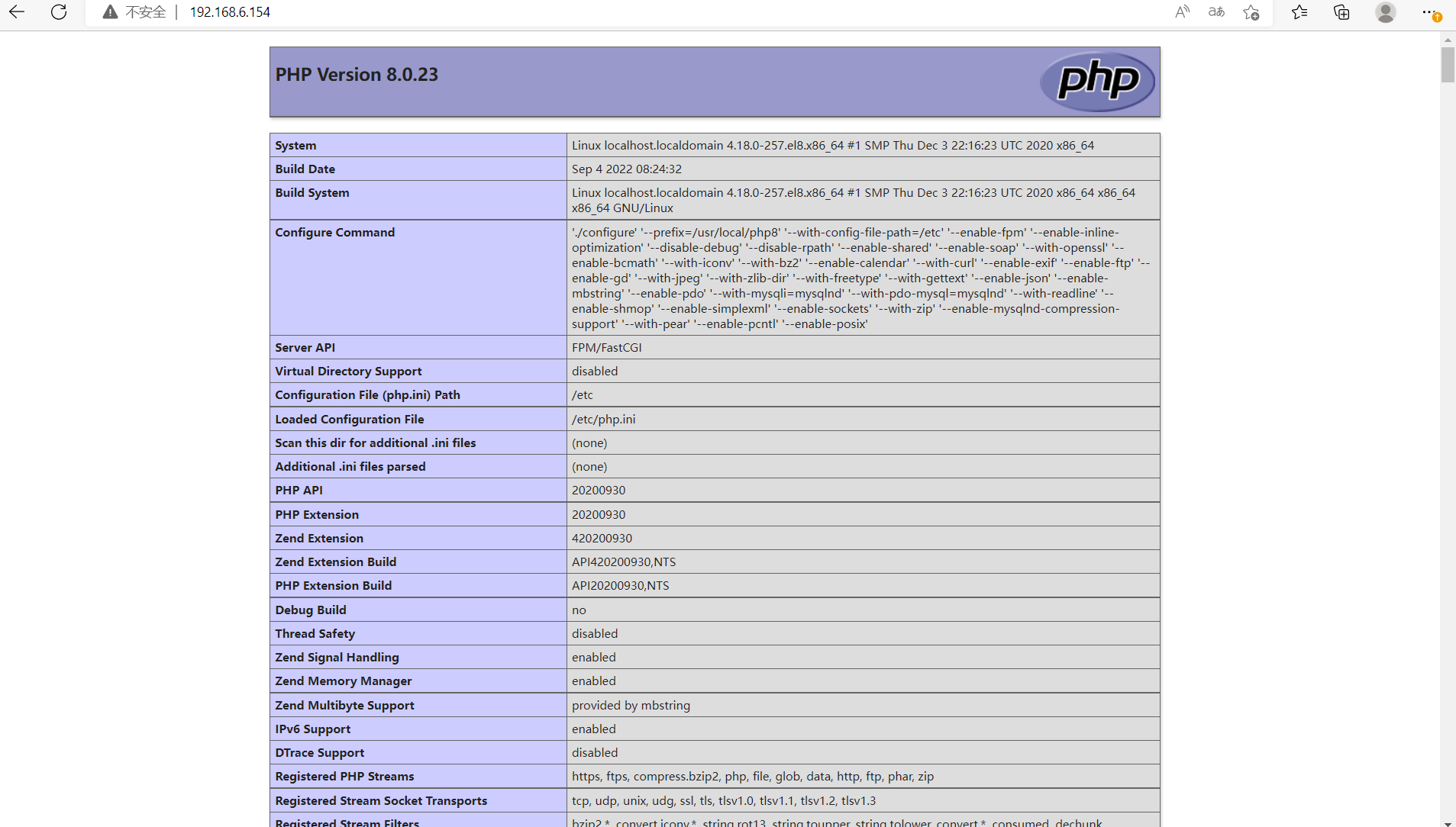 # 下载软件包 [root@localhost ~]# cd /usr/src/ [root@localhost src]# wget https://www.php.net/distributions/php-8.0.23.tar.gz # 安装依赖包 [root@localhost src]# dnf -y install libxml2-devel openssl openssl-devel bzip2 bzip2-devel libcurl libcurl-devel libicu-devel libjpeg libjpeg-devel libpng libpng-devel openldap-devel pcre-devel freetype freetype-devel gmp gmp-devel libmcrypt libmcrypt-devel readline readline-devel libxslt libxslt-devel mhash mhash-devel sqlite-devel libzip-devel php-mysqlnd # 安装 oniguruma 包 [root@localhost ~]# dnf -y install http://mirror.centos.org/centos/8-stream/PowerTools/x86_64/os/Packages/oniguruma-devel-6.8.2-2.el8.x86_64.rpm [root@localhost src]# ls debug mysql-8.0.12-linux-glibc2.12-x86_64.tar.xz nginx-1.22.0.tar.gz kernels nginx-1.22.0 php-8.0.23.tar.gz # 解压 [root@localhost src]# tar xf php-8.0.23.tar.gz [root@localhost src]# ls debug nginx-1.22.0 php-8.0.23.tar.gz kernels nginx-1.22.0.tar.gz mysql-8.0.12-linux-glibc2.12-x86_64.tar.xz php-8.0.23 # 编译安装php [root@localhost src]# cd php-8.0.23 [root@localhost php-8.0.23]# ./configure --prefix=/usr/local/php8 \ --with-config-file-path=/etc \ --enable-fpm \ --enable-inline-optimization \ --disable-debug \ --disable-rpath \ --enable-shared \ --enable-soap \ --with-openssl \ --enable-bcmath \ --with-iconv \ --with-bz2 \ --enable-calendar \ --with-curl \ --enable-exif \ --enable-ftp \ --enable-gd \ --with-jpeg \ --with-zlib-dir \ --with-freetype \ --with-gettext \ --enable-json \ --enable-mbstring \ --enable-pdo \ --with-mysqli=mysqlnd \ --with-pdo-mysql=mysqlnd \ --with-readline \ --enable-shmop \ --enable-simplexml \ --enable-sockets \ --with-zip \ --enable-mysqlnd-compression-support \ --with-pear \ --enable-pcntl \ --enable-posix [root@localhost php-8.0.23]# make [root@localhost php-8.0.23]# make install # 设置环境变量 [root@localhost php-8.0.23]# echo 'export PATH=/usr/local/php8/bin:$PATH' > /etc/profile.d/php8.sh [root@localhost php-8.0.23]# source /etc/profile.d/php8.sh [root@localhost php-8.0.23]# which php /usr/local/php8/bin/php # 设置头文件 [root@localhost ~]# ln -s /usr/local/php8/include /usr/include/php8 #设置库文件 [root@localhost ~]# echo '/usr/local/php8/lib' > /etc/ld.so.conf.d/php8.conf [root@localhost ~]# ldconfig # 查看版本 [root@localhost ~]# php -v PHP 8.0.23 (cli) (built: Sep 4 2022 08:26:51) ( NTS ) Copyright (c) The PHP Group Zend Engine v4.0.23, Copyright (c) Zend Technologies # 配置php-fpm [root@localhost ~]# cd /usr/src/php-8.0.23 # 这个文件已存在所以要加上\表示覆盖 [root@localhost php-8.0.23]# \cp php.ini-production /etc/php.ini [root@localhost php-8.0.23]# cp sapi/fpm/init.d.php-fpm /etc/init.d/php-fpm [root@localhost php-8.0.23]# ll -d /etc/init.d/php-fpm -rw-r--r-- 1 root root 2402 Sep 4 08:33 /etc/init.d/php-fpm [root@localhost php-8.0.23]# chmod +x /etc/init.d/php-fpm #增加执行权限 [root@localhost php-8.0.23]# ll -d /etc/init.d/php-fpm -rwxr-xr-x 1 root root 2402 Sep 4 08:33 /etc/init.d/php-fpm [root@localhost php-8.0.23]# cd /usr/local/php8/etc [root@localhost etc]# cp php-fpm.conf.default php-fpm.conf [root@localhost etc]# cd php-fpm.d [root@localhost php-fpm.d]# cp www.conf.default www.conf [root@localhost ~]# vim /usr/local/php8/etc/php-fpm.d/www.conf user = nginx group = nginx # 修改如下 # 启动php-fpm 、 并开机自启 [root@localhost ~]# service php-fpm start Starting php-fpm done [root@localhost ~]# ss -antl State Recv-Q Send-Q Local Address:Port Peer Address:Port Process LISTEN 0 128 127.0.0.1:9000 0.0.0.0:* LISTEN 0 128 0.0.0.0:80 0.0.0.0:* LISTEN 0 128 0.0.0.0:22 0.0.0.0:* LISTEN 0 70 *:33060 *:* LISTEN 0 128 *:3306 *:* LISTEN 0 128 [::]:22 [::]:* [root@localhost ~]# chkconfig --add php-fpm [root@localhost ~]# chkconfig php-fpm on #设置优先访问php页面 [root@localhost ~]# vim /usr/local/nginx/conf/nginx.conf index index.php index.html index.htm; # index后面添加index.php #更新配置文件 [root@localhost ~]# nginx -s reload # 最后验证能不能都开机自启 [root@localhost ~]# reboot WARNING! The remote SSH server rejected X11 forwarding request. Last login: Sun Sep 4 06:34:26 2022 from 192.168.6.1 [root@localhost ~]# ss -antl State Recv-Q Send-Q Local Address:Port Peer Address:Port Process LISTEN 0 128 0.0.0.0:80 0.0.0.0:* LISTEN 0 128 0.0.0.0:22 0.0.0.0:* LISTEN 0 128 127.0.0.1:9000 0.0.0.0:* LISTEN 0 128 [::]:22 [::]:* LISTEN 0 70 *:33060 *:* LISTEN 0 128 *:3306 *:*