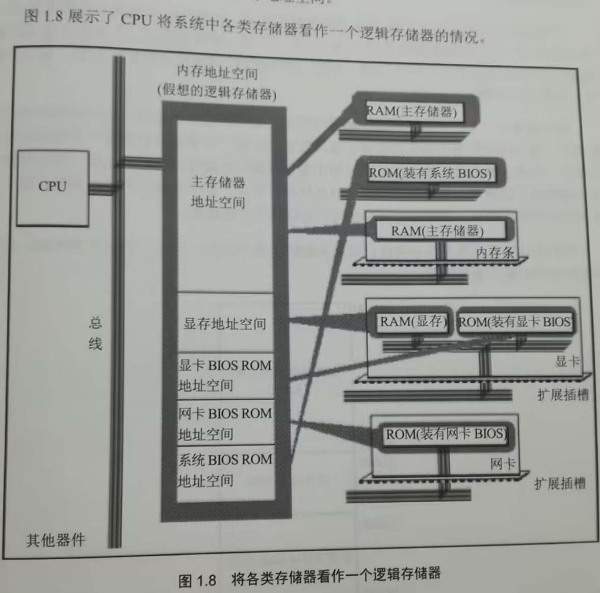 9.内存地址空间:最终运行程序的是CPU,我们用汇编语言编程的时候,必须要从CPU的角度考虑问题。对CPU来说,系统中的所有存储器中的存储单元都处于一个统一的逻辑存储器中,它的容量受CPU寻址能力的限制。这个逻辑地址即使我们所说的内存地址空间。