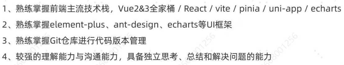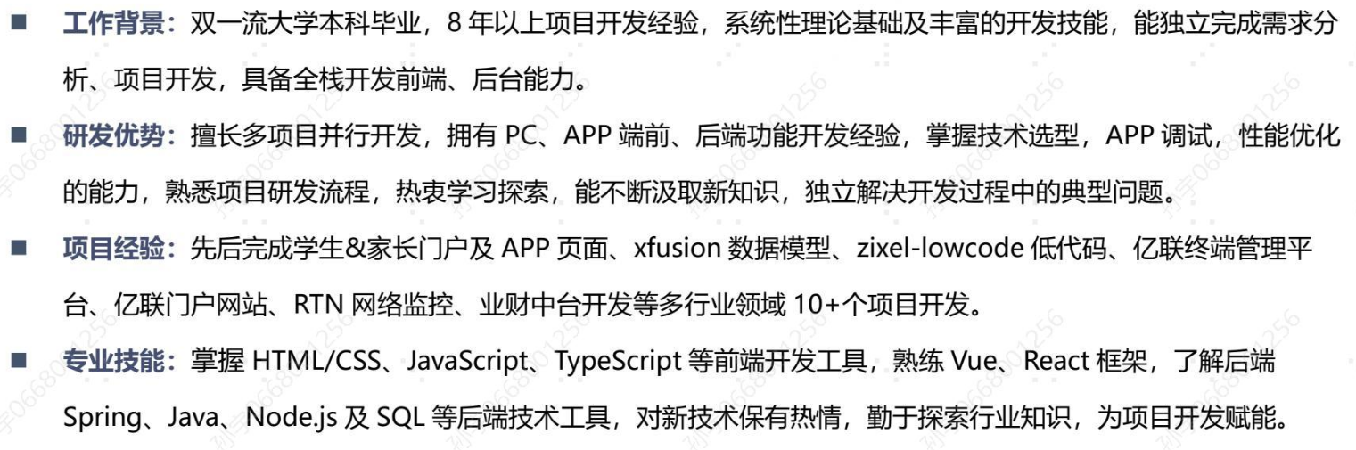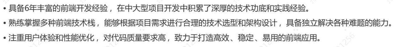 1、移动端经验丰富,相关知识面广 2、沟通能力强 3、前端基础知识扎实 4、工作中使用AI提效开发30% 5、vue3新技术知识不太了解,反馈能一周入手