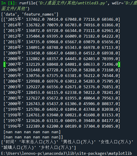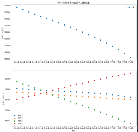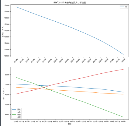 import numpy as np import matplotlib.pyplot as plt #使⽤numpy库读取⼈⼝数据 data=np.load('D:/桌面文件/pycharm 文件/populations.npz',allow_pickle=True) print(data.files)#查看⽂件中的数组 print(data['data']) print(data['feature_names']) plt.rcParams['font.sans-serif'] = 'SimHei' # 设置中文显示 plt.rcParams['axes.unicode_minus'] = False# 防止字符无法显示 name=data['feature_names']#提取其中的feature_names数组,视为数据的标签 values=data['data']#提取其中的data数组,视为数据的存在位置 p1=plt.figure(figsize=(12,12))#确定画布⼤⼩ pip1=p1.add_subplot(2,1,1)#创建⼀个两⾏⼀列的⼦图并开始绘制 #在⼦图上绘制散点图 plt.scatter(values[0:20,0],values[0:20,1])#,marker='8',color='red' plt.ylabel('总人口(万⼈)') plt.legend('年末') plt.title('1996~2015年末与各类人口散点图') pip2=p1.add_subplot(2,1,2)#绘制⼦图2 plt.scatter(values[0:20,0],values[0:20,2])#,marker='o',color='yellow' plt.scatter(values[0:20,0],values[0:20,3])#,marker='D',color='green' plt.scatter(values[0:20,0],values[0:20,4])#,marker='p',color='blue' plt.scatter(values[0:20,0],values[0:20,5])#,marker='s',color='purple' plt.xlabel('时间') plt.ylabel('总人口(万人)') plt.xticks(values[0:20,0]) plt.legend(['男性','女性','城镇','乡村']) #在⼦图上绘制折线图 p2=plt.figure(figsize=(12,12)) p1=p2.add_subplot(2,1,1) plt.plot(values[0:20,0],values[0:20,1])#,linestyle = '-',color='r',marker='8' plt.ylabel('总人口(万人)') plt.xticks(range(0,20,1),values[range(0,20,1),0],rotation=45)#rotation设置倾斜度 plt.legend('年末') plt.title('1996~2015年末总与各类人口折线图') p2=p2.add_subplot(2,1,2) plt.plot(values[0:20,0],values[0:20,2])#,'y-' plt.plot(values[0:20,0],values[0:20,3])#,'g-.' plt.plot(values[0:20,0],values[0:20,4])#,'b-' plt.plot(values[0:20,0],values[0:20,5])#,'p-' plt.xlabel('时间') plt.ylabel('总人口(万人)') plt.xticks(values[0:20,0]) plt.legend(['男性','女性','城镇','乡村']) #显⽰图⽚ plt.show()