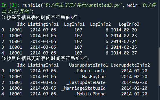import pandas as pd LogInfo = pd.read_csv('D:/桌面文件/pycharm 文件/Training_LogInfo.csv',encoding='gbk') Userupdate = pd.read_csv('D:/桌面文件/pycharm 文件/Training_Userupdate.csv',encoding='gbk') # 转换时间字符串 LogInfo['Listinginfo1']=pd.to_datetime(LogInfo['Listinginfo1']) LogInfo['LogInfo3']=pd.to_datetime(LogInfo['LogInfo3']) print('转换登录信息表的时间字符串前5行:\n',LogInfo.head()) Userupdate['ListingInfo1']=pd.to_datetime(Userupdate['ListingInfo1']) Userupdate['UserupdateInfo2']=pd.to_datetime(Userupdate['UserupdateInfo2']) print('转换用户信息更新表的时间字符串前5行:\n',Userupdate.head())