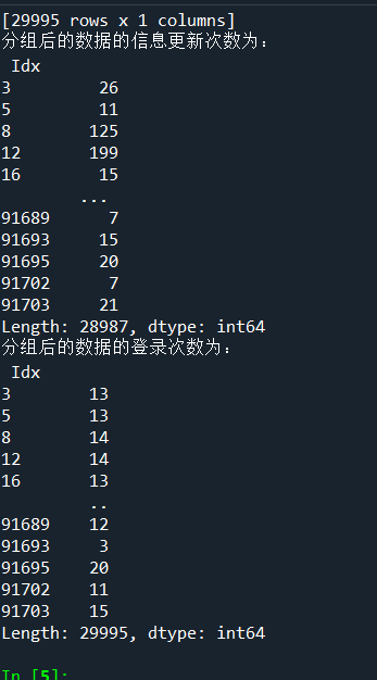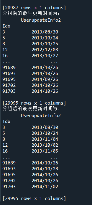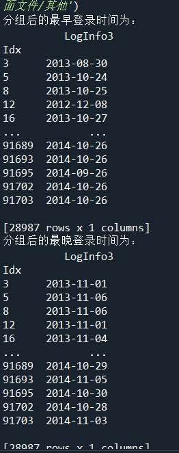 #代码18-1 import pandas as pd import numpy as np LogInfo = pd.read_csv('D:/桌面文件/pycharm 文件/Training_LogInfo.csv',encoding='gbk') Userupdate = pd.read_csv('D:/桌面文件/pycharm 文件/Training_Userupdate.csv',encoding='gbk') # 使用groupby方法对用户信息更新表和登录信息表进行分组 LogGroup = LogInfo[['Idx','LogInfo3']].groupby(by = 'Idx') UserGroup = Userupdate[['Idx','UserupdateInfo2']].groupby(by = 'Idx') #代码18-2 # 使用agg方法求取分组后的最早,最晚,更新登录时间 print('分组后的最早登录时间为:\n',LogGroup.agg(np.min)) print('分组后的最晚登录时间为:\n',LogGroup.agg(np.max)) print('分组后的最早更新时间为:\n',UserGroup.agg(np.min)) print('分组后的最晚更新时间为:\n',UserGroup.agg(np.max)) #代码18-3 # 使用size方法求取分组后的数据的信息更新次数与登录次数 print('分组后的数据的信息更新次数为:\n',LogGroup.size()) print('分组后的数据的登录次数为:\n',UserGroup.size())