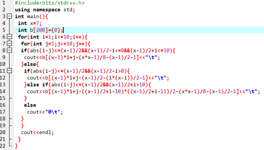 经过观察推理发现对角线的元素符合公式3*i-2,而3*i-2-1和3*i-2+1就是对角线元素左右两边的元素。j为矩阵的列数,让j>=i-1且j<=i+1时打印j,而原来的3*i-2我们可以看成i+i+i+2,把其中的一个i用j代替,用j取3个数,i+1和i-1和i,这样我们就可以导出原有的公式2*i+j-2,因为我们b是从b[0]开始的,所以第一个数是b[0],所以要在2*i+j-2的基础上-1,我们就导出了公式2*i+j-3。