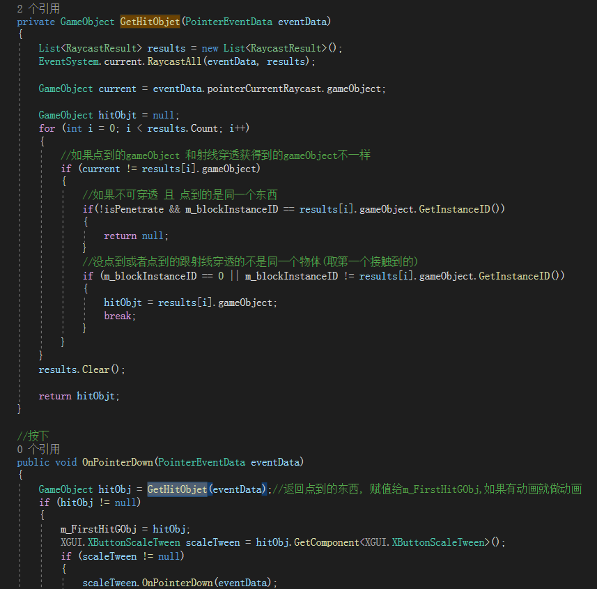RaycastAll后ugui会自己排序,只获取 射线 透下去的最近的一个物体,直接保存物体, break