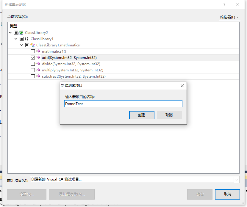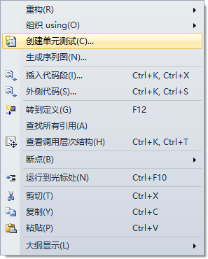 (1)创建单元测试:右键代码-->选择创建单元测试-->确定。截图如下: