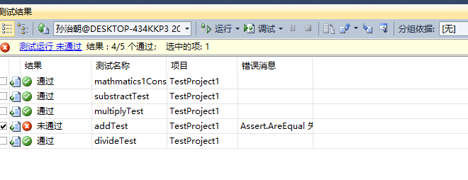 测试结果显示有四个通过测试,一个未通过测试。现在查看测试的详细结果: