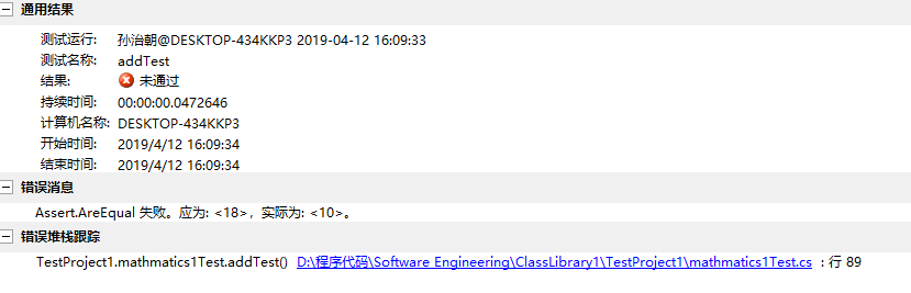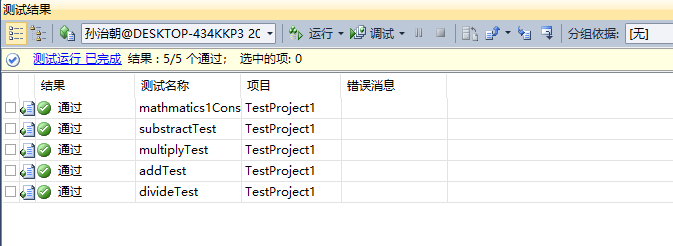 通过查看详细测试结果,我们可以获得的信息是:测试add()函数时,期望值是:18,实际输出值是:10。在编写单元测试代码时,由于我的不仔细,把期望值"10"误写为了"18"。现在修改单元测试代码,重新运行测试,得到正确的测试结果: