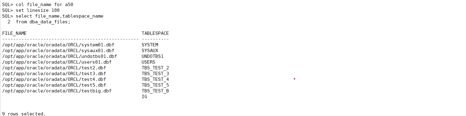 上图中可以看到4种类型的数据文件:系统数据文件 (SXSTEMO1.DBF 和 SYSAUX01.DBF)、撇销数据文件 CUNDOTBS1,DBF) 和用户数据文件(USERSI.DBF、EXAMPLE01.DBF、TBSP_1.DBF和 TBSP_2.DBF),和创建的 (TBS_TEST.DBF )下面对 3种类型的数据文件进行介绍。