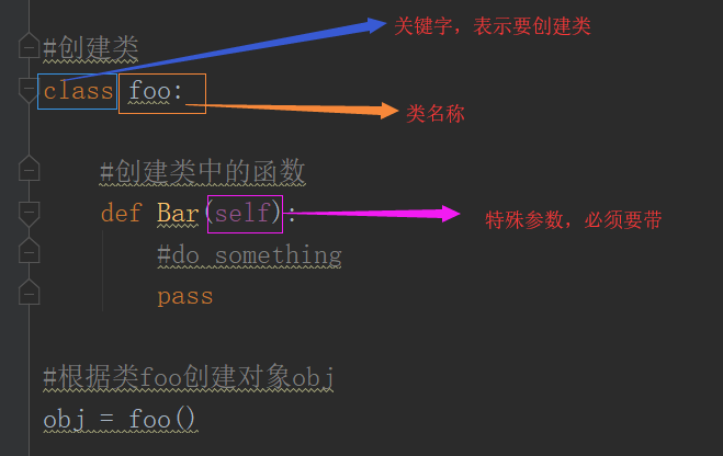 1 #创建类 2 class foo: 3 def bar(self): 4 print('bar') 5 6 def hello(self, name): 7 print("i is %s" % name) 8 9 #根据foo类创建对象obj 10 obj = foo() 11 obj.bar() #执行bar方法 12 obj.hello('铁棍') #执行hello方法