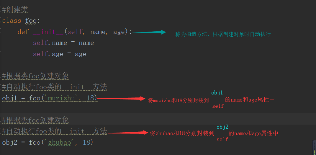 self是一个形式参数,当执行obj1 = foo(‘muzizhu’,18)时,self等于obj1l;当执行obj2 = foo('zhubao',18)时,self等于obj2