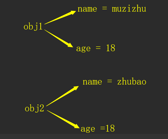 所以,内容其实被封装到了对象obj1和obj2中,每个对象中都有name 和age属性,在内存里类似于下图来保存。