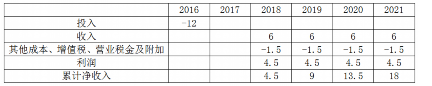 1.某项目2016年投资额12万元,2018年开始取得项目的净收益(产品-原料辅料及公用工程)6万元/年,2018-2021年每年还会产生其他成本(包括人员工资管理成本、制造成本等)1.1万元/年,增值税0.35万元/年,营业税金及附加0.05万元/年,则该项目的静态投资回收期为(66)年,截止到2021年底该项目的投资收益率是(67)