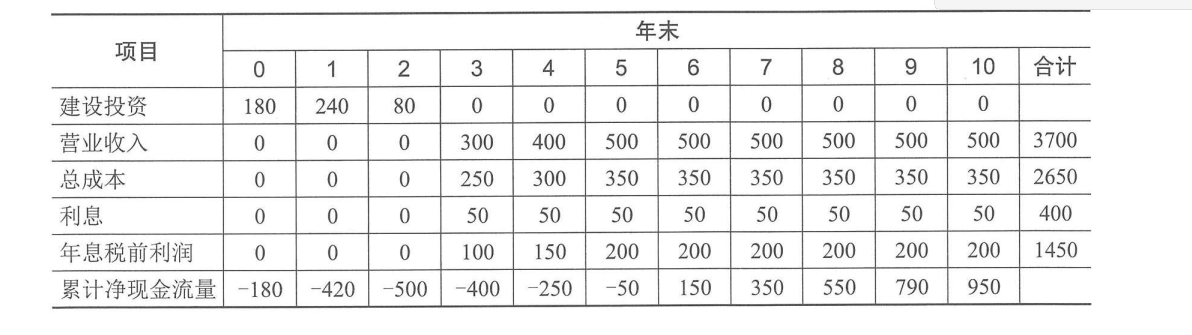 建设投资分布在第0至2年,分别为180、240、80万元,合计:
