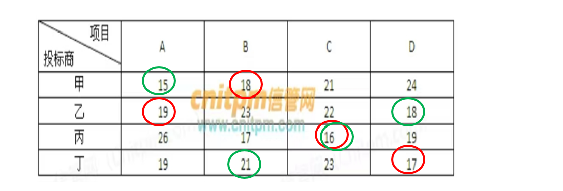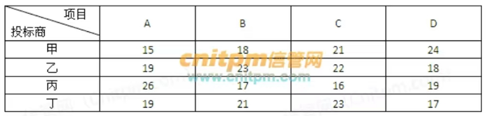 某公司要把4个有关能源工程项目承包给4个互不相关的外商投标者,规定每个承包商只能且必须承包一个项目,在总费用最小的条 下确定各个项目的承包者,总费用为( A )。(各承包商对工程的报价如下表所示)