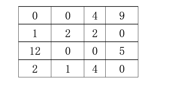 4.因为独立0元素不足4个,需要继续归约,在未划线 元素中找到最小值,各个元素减去最小值,交叉点处元素加上最小值。未划线部分最小值是2。如下表,未划线部分减去最小值后继续划线。