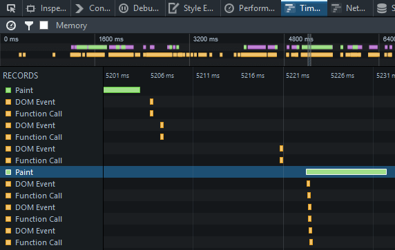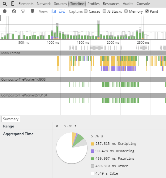 目前主流浏览器都在开发者工具中提供了监控页面重绘的功能。在Blink/Webkit 内核的浏览器中,使用 Timeline 面板可以记录一个页面活动详情: