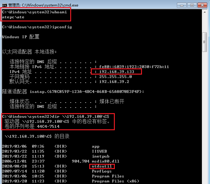 攻击成功后获取到一个shell,虽然是本机的,但可以操控域控,如下: