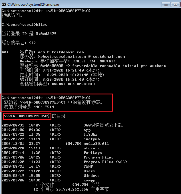 普通用户伪造银票并导入内存获取权限,可取到域控krbtgt hash。/target指定服务主机名,/rc4指定服务密码的hash,/service指定服务,如下。